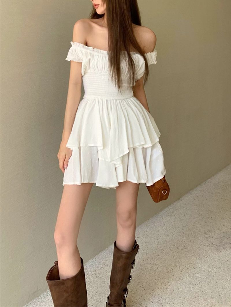 3D Dots Smocked Ruffles White Playsuit Romper Layered Jumpsuit Dress
