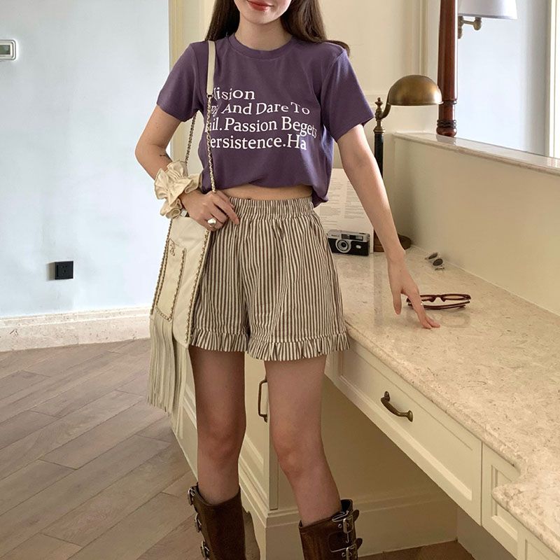 Elastic Stretchy Cute Stripes Waistband Ruffle Edge Womens Shorts