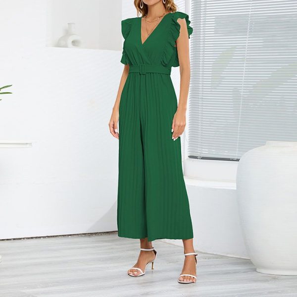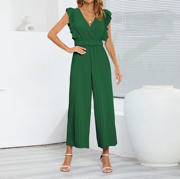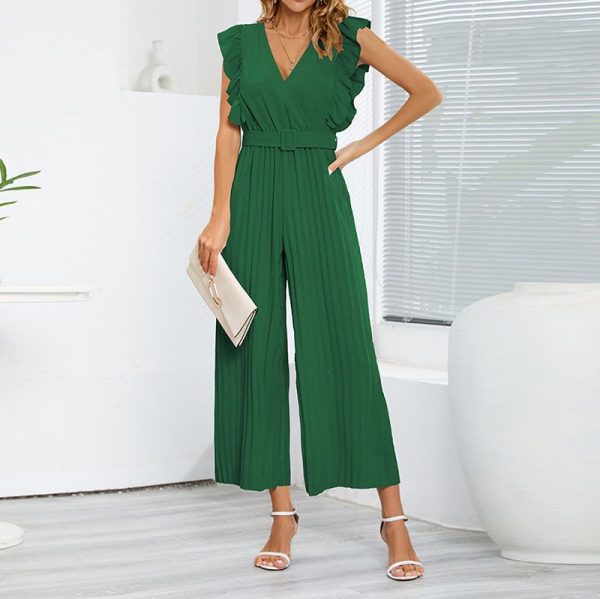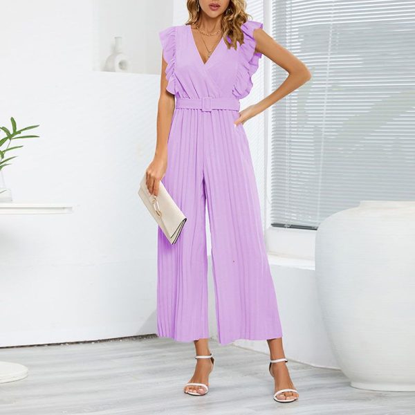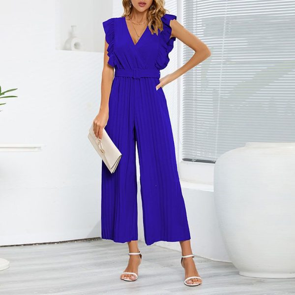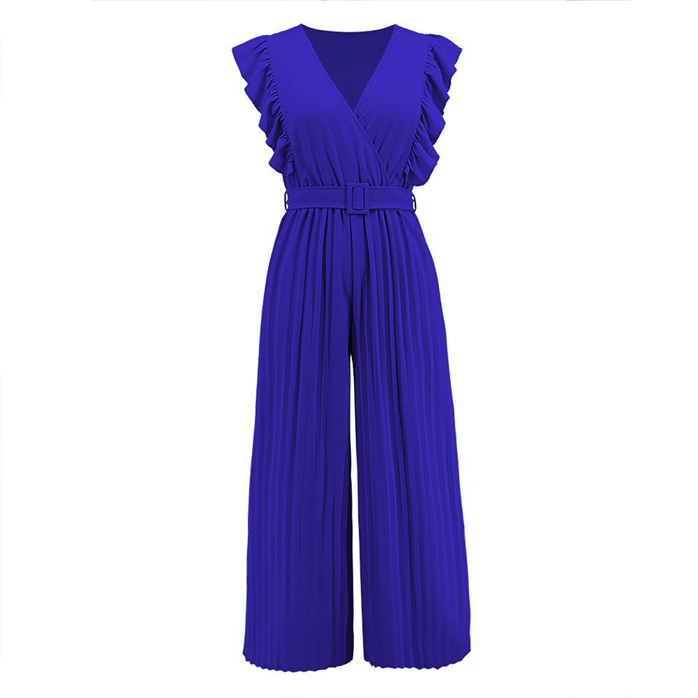 / Formal Belted Ruffle Pleated V Neck Wide Leg Palazzo Jumpsuits For Women